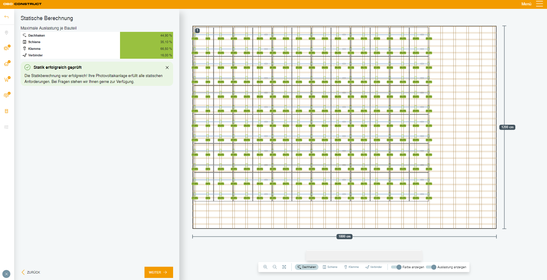 Voit laatia aurinkosähköprojektisi verkossa, käsitellä suunnitelmaasi ja tallentaa sen. Työkalumme laskee automaattisesti tarvittavien rakenneosien määrät ja luo niistä suunnitelmaan pohjautuvan alusrakenteen ja aurinkopaneelien suunnittelukaavion. Ne ovat helposti ladattavissa eri tiedostomuodoissa kuten myös tarjouspyyntötekstit ja eri dokumentit asennusrakenteemme lujuuslaskelmia varten.