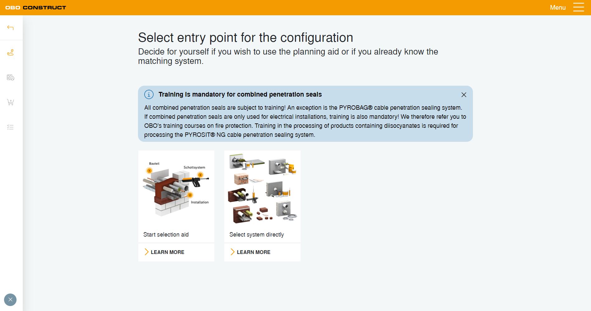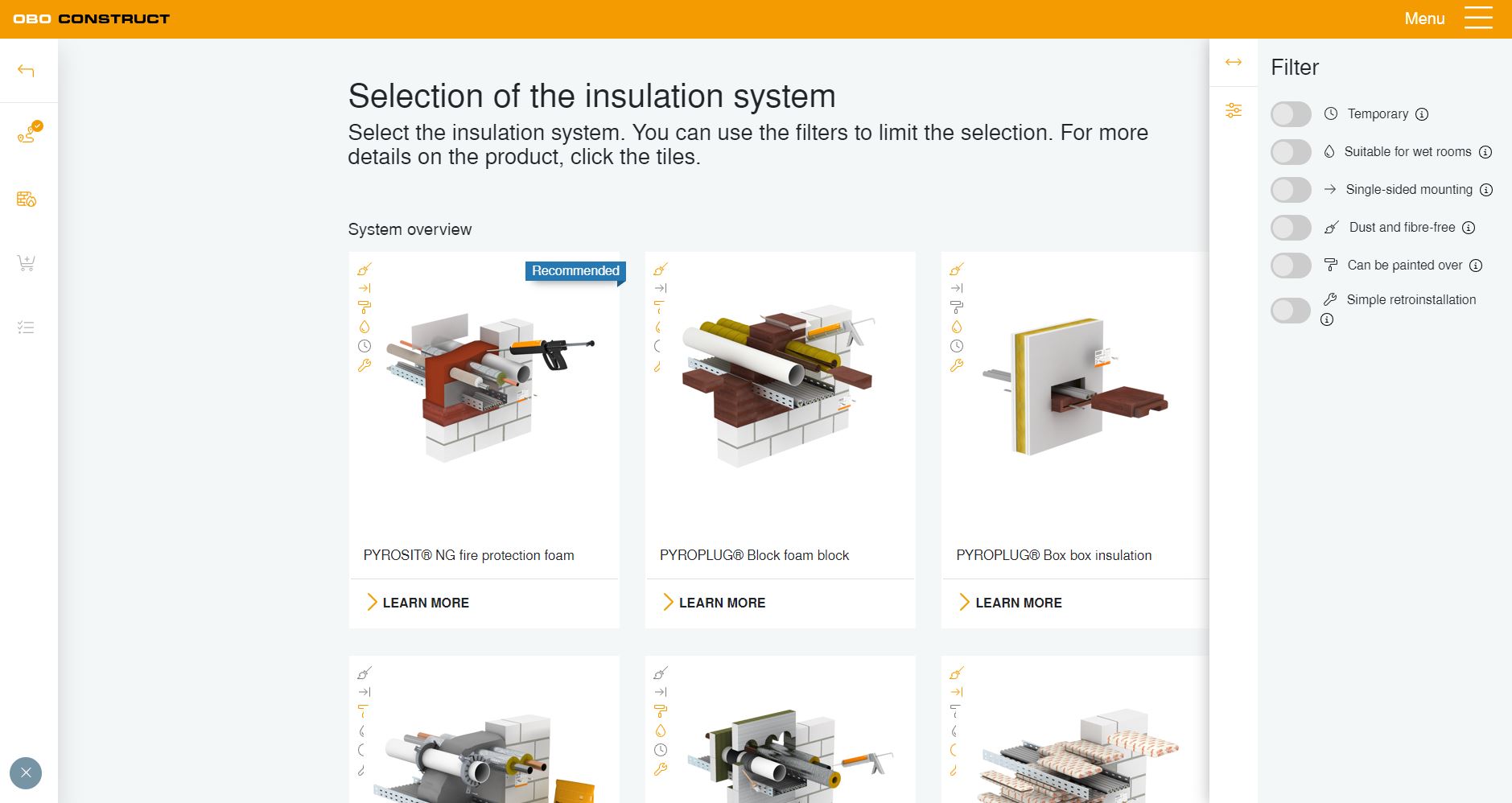Tämän suunnittelutyökalun avulla voit tehdä palokatkosuunnitelmasi vaatimusten mukaisesti. Löydät vaiheittain sopivan palokatkojärjestelmän vastaamalla muutamiin kysymyksiin. Verkkosovelluksen avulla voit luoda ja tallentaa projektin ja käsitellä sitä jälkeenpäin millä tahansa päätelaitteella.