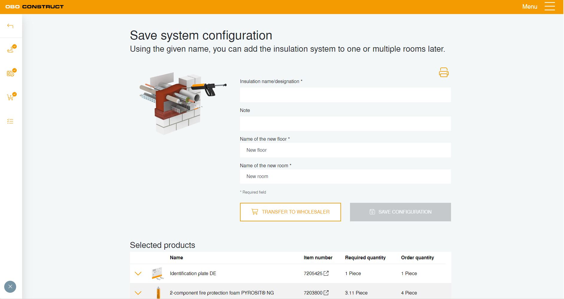 Tilausluettelon lisäksi, joka laskee automaattisesti kaikki tarvittavat määrät, voit ladata tila- ja valikoimakohtaisen tarvikeluettelon. Vaatimustenmukaisuusvakuutus, jonka rakennuttajat nykyisin yleensä vaativat, laaditaan myös automaattisesti ja voit suoraan ladata sen.