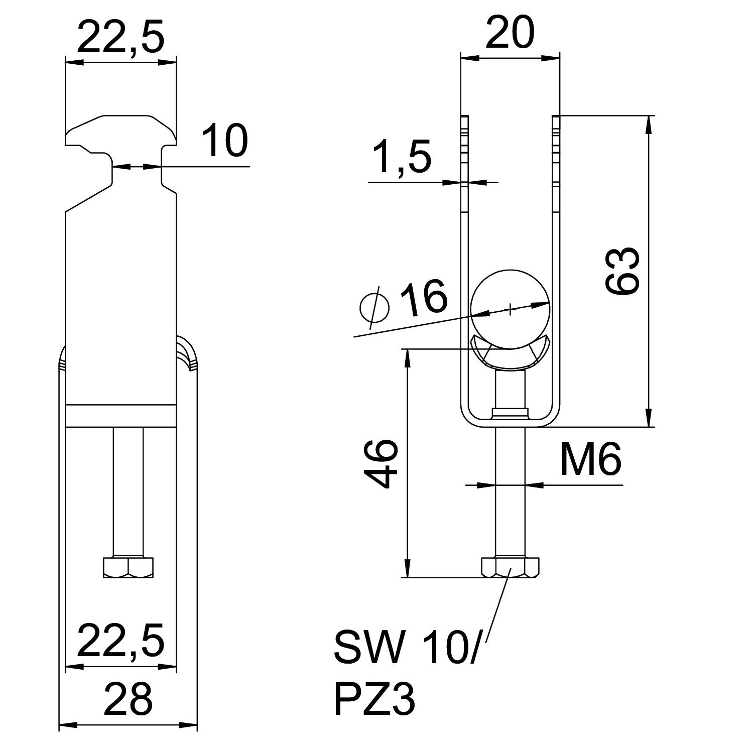 Tuotteen kuvausBügelschelle mit Hammerkopf-Fuß, Metalldruckwanne mit gerundeten Kanten für Kabelschutz. Zur vertikalen und horizontalen Montage von 2 Einzelkabeln an C-Profilschiene. Für Schlitzweite 16 - 17 mm. Mit 1-gängiger Schraube an Druckwanne, universeller Sechskant-Schraubenkopf SW10, mit Schlitz und Kreuzschlitz. Geeignet für Montage im Innen- und Außenbereich. Mehrere Kabel sollten durch Doppelwannen getrennt werden. Der Einsatz einer Gegenwanne wird empfohlen.