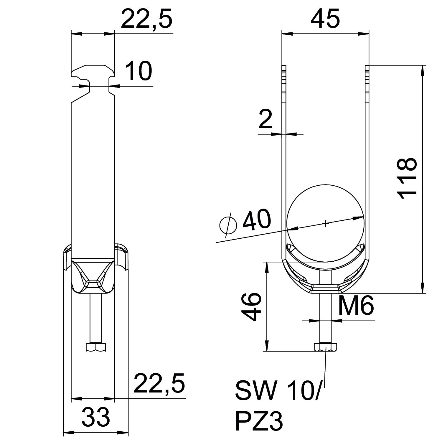 Tuotteen kuvausBügelschelle mit Hammerkopf-Fuß, Metalldruckwanne mit gerundeten Kanten für Kabelschutz. Zur vertikalen und horizontalen Montage von 2 Einzelkabeln an C-Profilschiene. Für Schlitzweite 16 - 17 mm. Mit 1-gängiger Schraube an Druckwanne, universeller Sechskant-Schraubenkopf SW10, mit Schlitz und Kreuzschlitz. Geeignet für Montage im Innen- und Außenbereich. Mehrere Kabel sollten durch Doppelwannen getrennt werden. Der Einsatz einer Gegenwanne wird empfohlen.