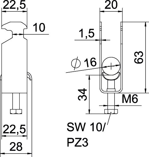 Tuotteen kuvausBügelschelle mit Hammerkopf-Fuß, Metalldruckwanne mit gerundeten Kanten für Kabelschutz. Zur vertikalen und horizontalen Montage von 2 Einzelkabeln an C-Profilschiene. Für Schlitzweite 16 - 17 mm. Mit 1-gängiger Schraube an Druckwanne, universeller Sechskant-Schraubenkopf SW10, mit Schlitz und Kreuzschlitz. Geeignet für Montage im Innen- und Außenbereich. Mehrere Kabel sollten durch Doppelwannen getrennt werden. Der Einsatz einer Gegenwanne wird empfohlen.