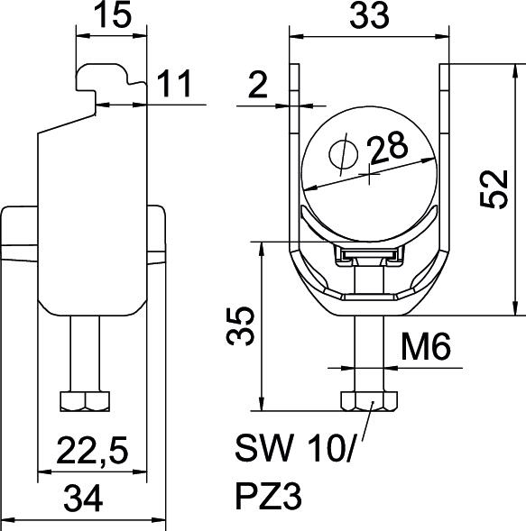 Tuotteen kuvausBügelschelle mit N-Fuß, Kunststoffdruckwanne aus Polypropylen. Zur vertikalen und horizontalen Montage von 1 Einzelkabel an C-Profilschiene. Für Schlitzweite 11 - 12 mm. Mit 1-gängiger Schraube an Druckwanne, universeller Sechskant-Schraubenkopf SW10, mit Schlitz und Kreuzschlitz. Geeignet für Montage im Innen-und Außenbereich. Der Einsatz einer Gegenwanne wird empfohlen.