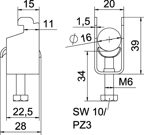 Tuotteen kuvausBügelschelle mit N-Fuß, Metalldruckwanne mit gerundeten Kanten für Kabelschutz. Zur vertikalen und horizontalen Montage von 1 Einzelkabel an C-Profilschiene. Für Schlitzweite 11 - 12 mm. Mit 1-gängiger Schraube an Druckwanne, universeller Sechskant-Schraubenkopf SW10, mit Schlitz und Kreuzschlitz. Geeignet für Montage im Innen-und Außenbereich. Der Einsatz einer Gegenwanne wird empfohlen.