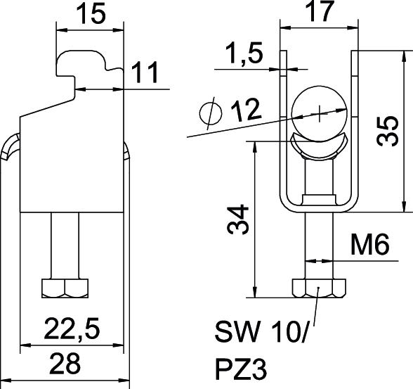 Tuotteen kuvausBügelschelle mit N-Fuß, Metalldruckwanne mit gerundeten Kanten für Kabelschutz. Zur vertikalen und horizontalen Montage von 1 Einzelkabel an C-Profilschiene. Für Schlitzweite 11 - 12 mm. Mit 1-gängiger Schraube an Druckwanne, universeller Sechskant-Schraubenkopf SW10, mit Schlitz und Kreuzschlitz. Geeignet für Montage im Innen-und Außenbereich. Der Einsatz einer Gegenwanne wird empfohlen.