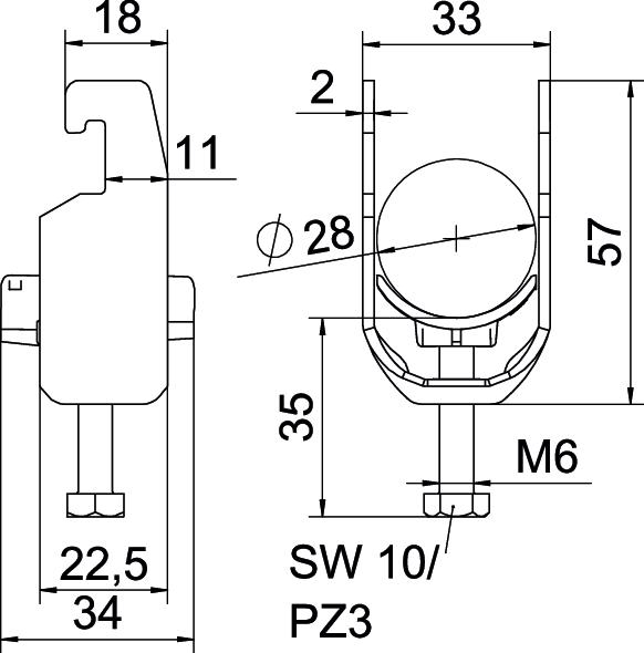 Tuotteen kuvausBügelschelle mit U-Fuß, Kunststoffdruckwanne aus Polypropylen. Zur vertikalen und horizontalen Montage von 1 Einzelkabel an C-Profilschiene. Für Schlitzweite 18 - 22 mm. Mit 1-gängiger Schraube an Druckwanne, universeller Sechskant-Schraubenkopf SW10, mit Schlitz und Kreuzschlitz. Geeignet für Montage im Innen-und Außenbereich. Der Einsatz einer Gegenwanne wird empfohlen.
