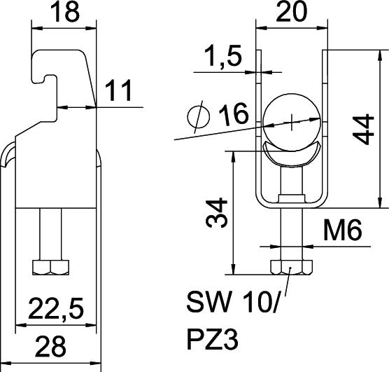 Tuotteen kuvausBügelschelle mit U-Fuß, Metalldruckwanne mit gerundeten Kanten für Kabelschutz. Zur vertikalen und horizontalen Montage von 1 Einzelkabel an C-Profilschiene. Für Schlitzweite 18 - 22 mm. Mit 1-gängiger Schraube an Druckwanne, universeller Sechskant-Schraubenkopf SW10, mit Schlitz und Kreuzschlitz. Geeignet für Montage im Innen-und Außenbereich. Der Einsatz einer Gegenwanne wird empfohlen.