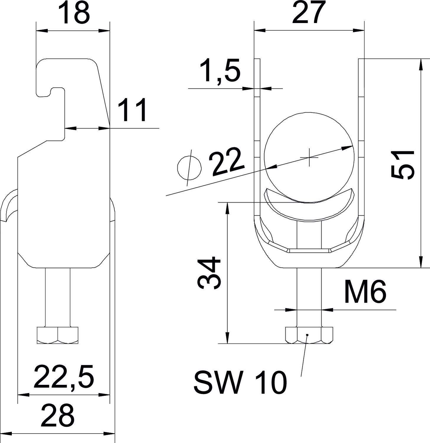 Tuotteen kuvausBügelschelle mit U-Fuß, Metalldruckwanne mit gerundeten Kanten für Kabelschutz. Zur vertikalen und horizontalen Montage von 1 Einzelkabel an C-Profilschiene. Für Schlitzweite 18 - 22 mm. Mit 1-gängiger Schraube an Druckwanne, universeller Sechskant-Schraubenkopf SW10, mit Schlitz und Kreuzschlitz. Geeignet für Montage im Innen-und Außenbereich. Der Einsatz einer Gegenwanne wird empfohlen.