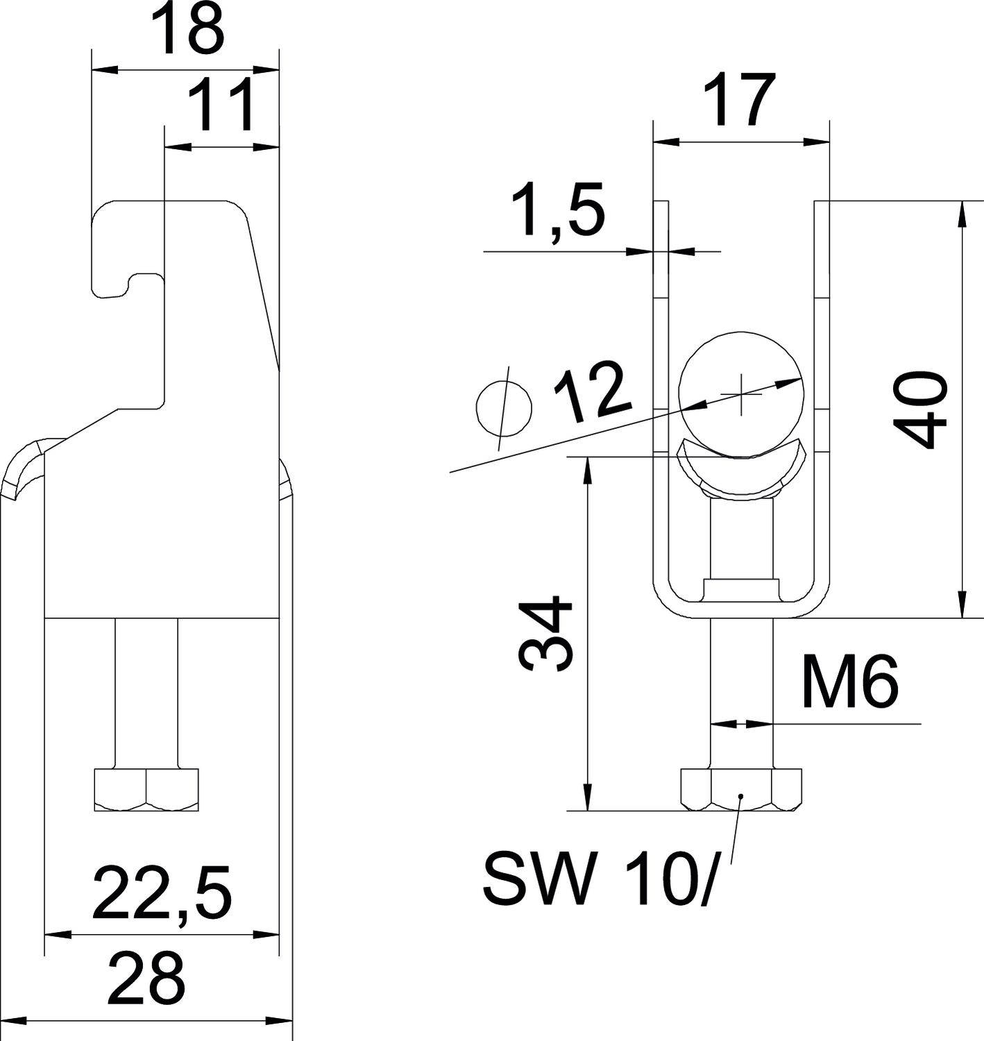Tuotteen kuvausBügelschelle mit U-Fuß, Metalldruckwanne mit gerundeten Kanten für Kabelschutz. Zur vertikalen und horizontalen Montage von 1 Einzelkabel an C-Profilschiene. Für Schlitzweite 18 - 22 mm. Mit 1-gängiger Schraube an Druckwanne, universeller Sechskant-Schraubenkopf SW10, mit Schlitz und Kreuzschlitz. Geeignet für Montage im Innen-und Außenbereich. Der Einsatz einer Gegenwanne wird empfohlen.
