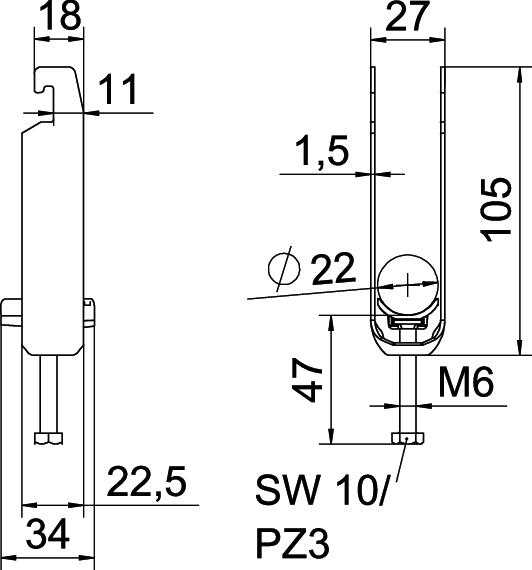 Tuotteen kuvausBügelschelle mit U-Fuß, Kunststoffdruckwanne aus Polypropylen. Zur vertikalen und horizontalen Montage von 3 Einzelkabeln an C-Profilschiene. Für Schlitzweite 18 mm oder 22 mm. Mit 1-gängiger Schraube an Druckwanne, universeller Sechskant-Schraubenkopf SW10, mit Schlitz und Kreuzschlitz. Geeignet für Montage im Innen- und Außenbereich. Mehrere Kabel sollten durch Doppelwannen getrennt werden. Der Einsatz einer Gegenwanne wird empfohlen.