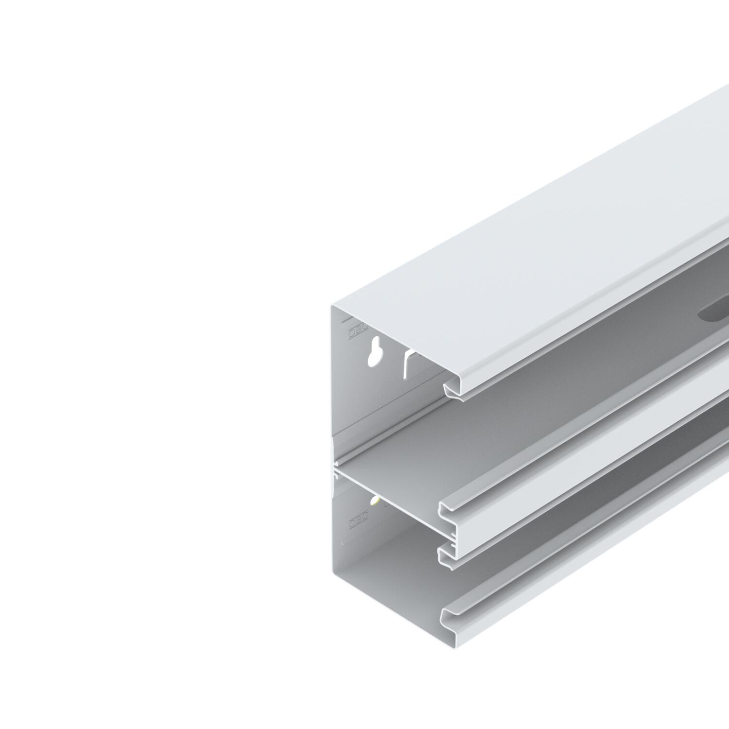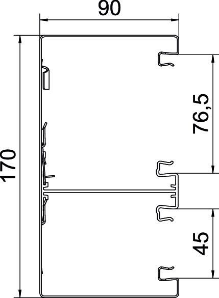 Tuotteen kuvausJohtokanava GS asennettavaksi suoraan seinään tai seinäkiinnikkeisiin. Johtokanavassa on kiinnikkeet teräspeltisen väliseinän kiinnitykseen. Kanavaosien välinen potentiaalintasaus toteutetaan jatkokappaleella. Kannen ja kanavan välinen maadoitus ja potentiaalitasaus on varmistettu patentoidulla kannen erikoisrakenteella. Kansiaukko kalusteiden asennukseen on 76,5 mm. Kanavan toista uraa 45 mm aukolla käytetään johtojen asennukseen. Modul 45 -sarjan kytkimiä ja pistorasioita ei voi asentaa siihen. Kansi pitää tilata erikseen.