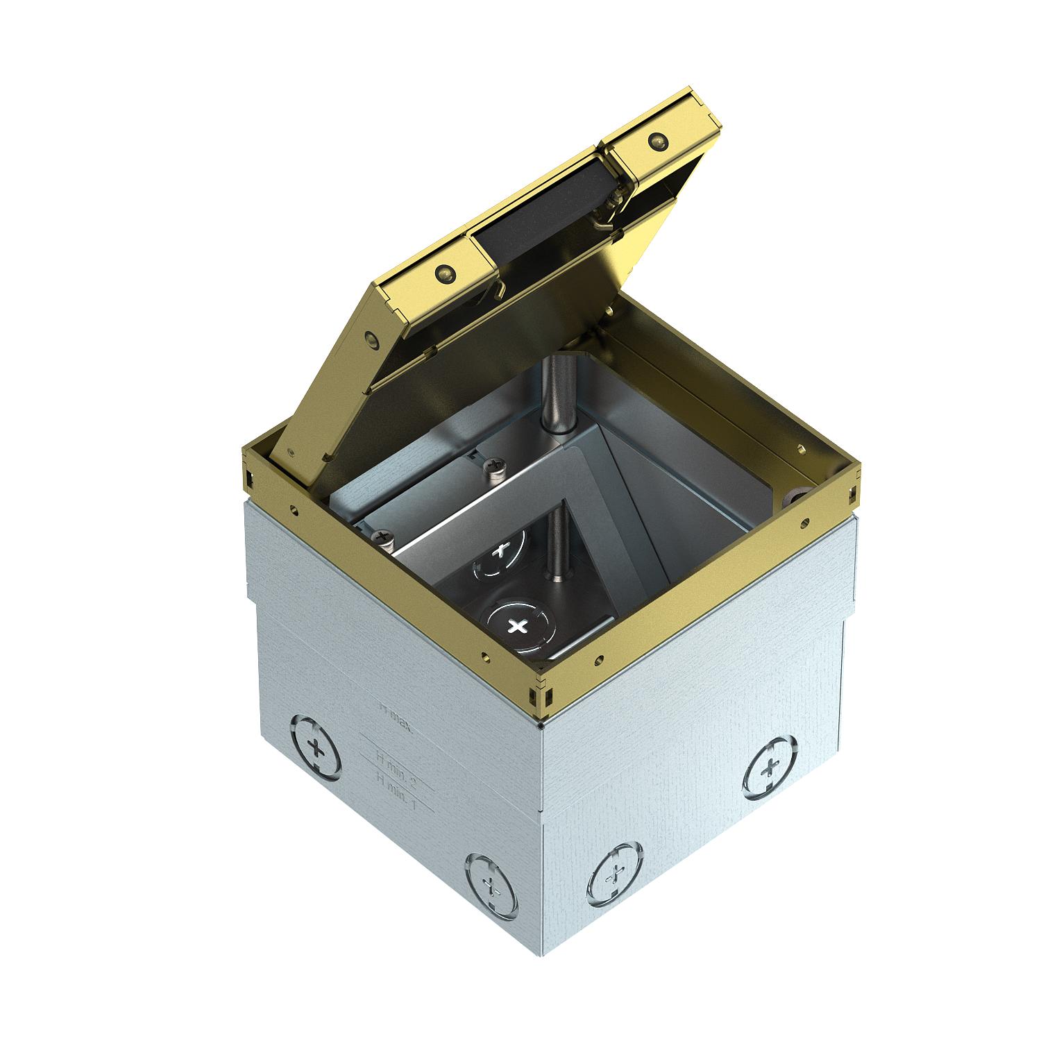 Lattiapinnoitteessa näkyvä kehys ja kansi messinkiä. Tyhjä lattiarasia kahdelle Modul 45®-asennuskalusteelle asennuskehyksessä ja kahdelle dataliittimelle liitinlevyssä. 15 kN kuormitettavuus taataan vain suljetussa tilassa, lattiapinnan tasalla.