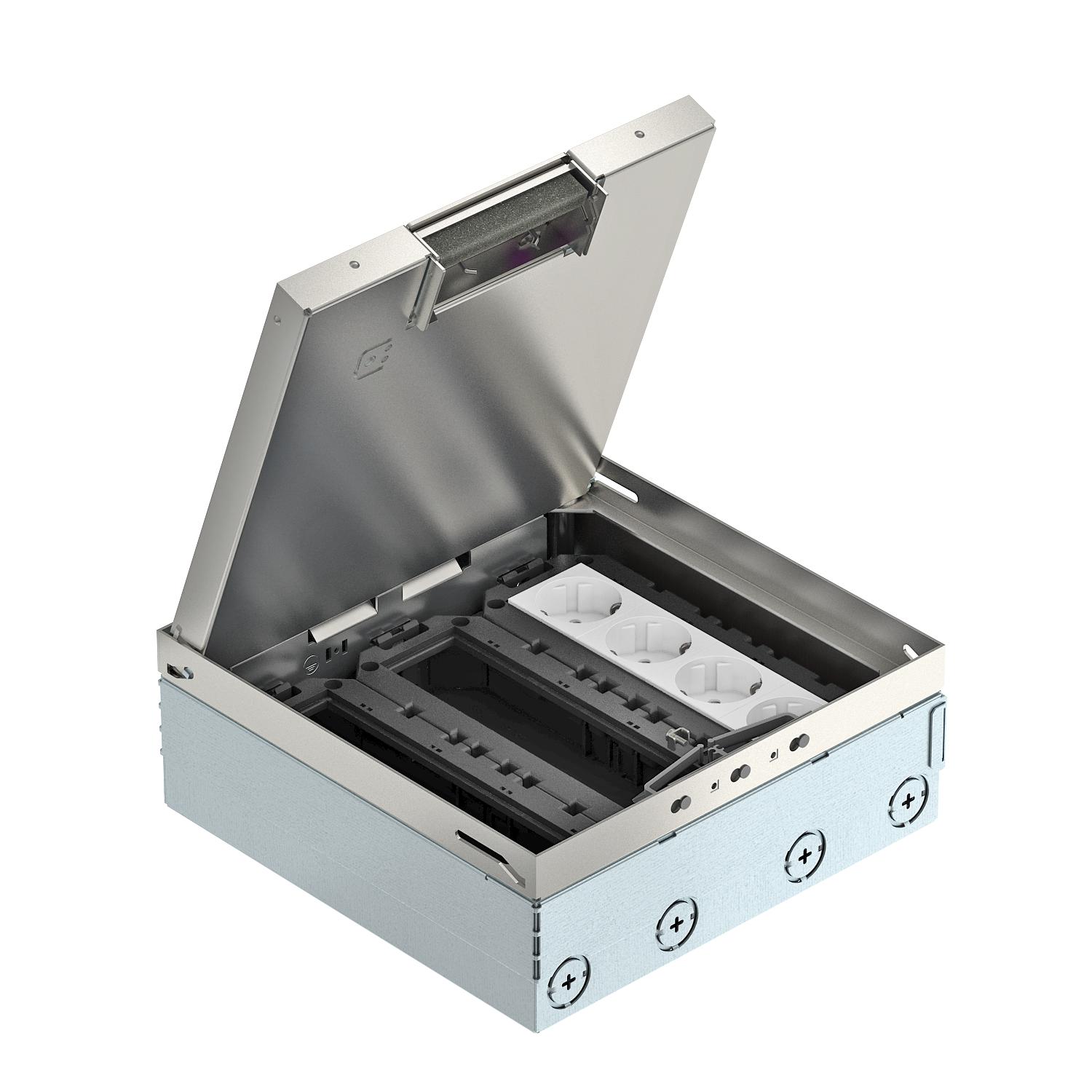 Tuotteen kuvausNelikulmainen lattiarasia käytettäväksi sisätilojen kuivapuhdistettavissa lattioissa, asennus valuun ja ontelolattiaan. Lattiarasia asennusputkiaihioilla (M25). 3 kojerasialla UT4 ja kahdella 2-osaisella suojakosketinpistorasialla. Kansi voidaan säätää 4 säätöjalan avulla lattiapinnoitteen tasalle. Vähimmäisasennussyvyys on 95 mm, säätöalue + 30 mm.
