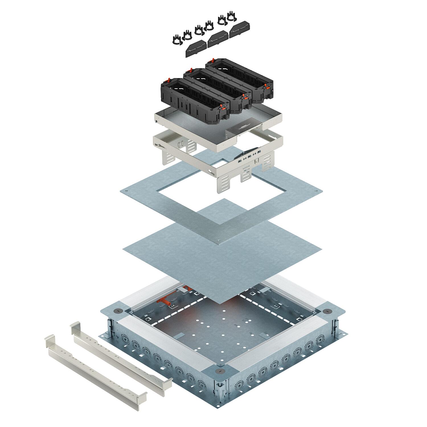 - kolme kojerasiaa UT4/45 kukin neljälle Modul 45® -kalusteelle. Lattiarasia ja johtoaukko ruostumatonta terästä. Lattiarasian lattiapinnoitesyvennys: 20 mm.