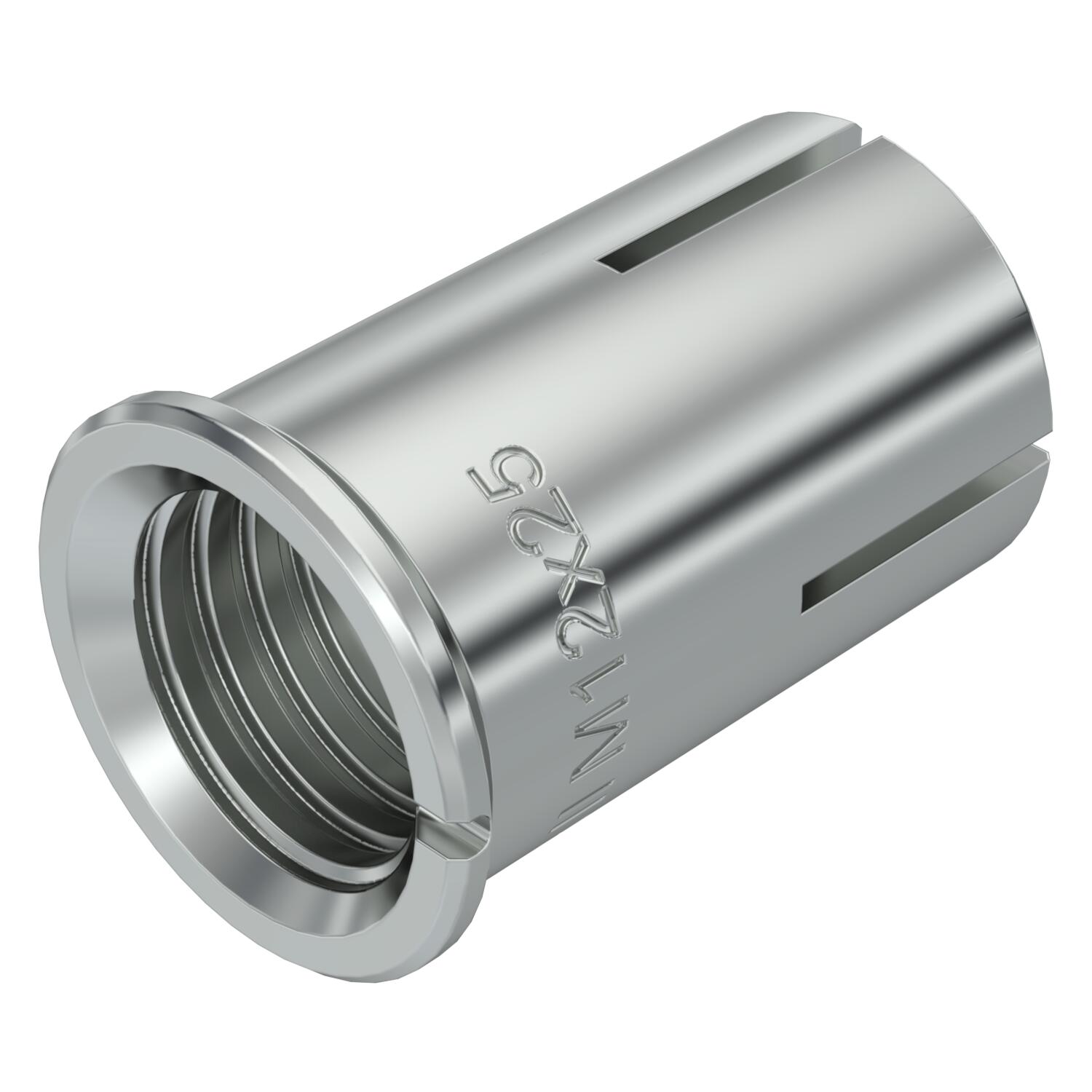 Tuotteen kuvausLyöntiankkuri monikertaiseen kiinnitykseen, sisäkierteellä teräksestä, esim. kaapelihyllyjen, kannakkeiden, teräsrakenteiden jne. kiinnittämiseen halkeilemattomaan betoniin sisä- ja ulkotiloissa. Lyödään vasaralla. Korotettu reuna estää joutumasta porareiän sisään. Ruostumaton ja erittäin korroosionkestävä. Ankkuriholkki jännittyy porareiän seinämää vasten, kun sisäpuolinen tappi lyödään sisään esim. käsikäyttöisellä asennustyökalulla EHS M. Palonkestävyys testattu, paloluokitus R 120 Eurooppalaisen teknisen hyväksynnän ETA-07/0135 mukaan betonille.