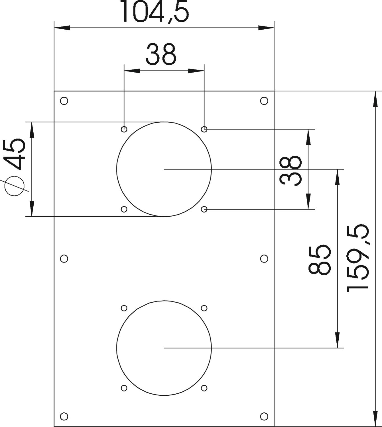 Tuotteen kuvausPeitelevy Ø 45 mm:n aukolla kahden pistorasian (tyyppi ASD-...) asennukseen 38 mm:n kiinnitysvälillä, sisältäen 8 ruuvia kalustekiinnitykseen.