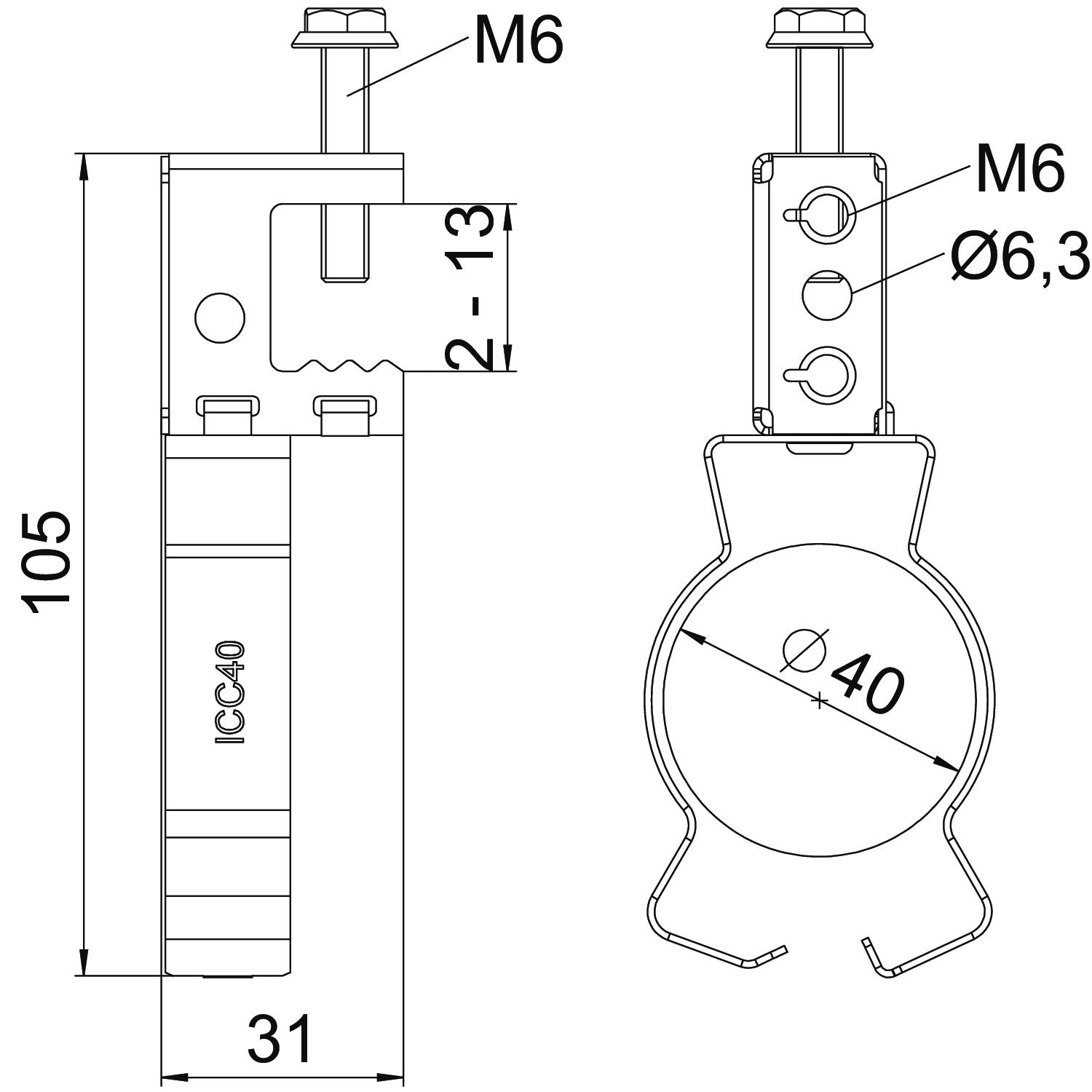 Kiinnityskappale, säädettävä ei Kiinnitystapa kiinnitys Koko 2-13mm Korkeus 105 mm Laipan paksuus F maks. 16 mm Laipan paksuus F min. 2 mm Liitäntätapa/-rakenneosa Asennusputki/kaapeli Materiaali teräs Mitta H 105 mm Murtokuorma 0,45 kN Pinta Sinkkikerros Pituus 31 mm Pohjamitta 44 mm Putken/kaapelin halkaisija maks. 40 mm Putken/kaapelin halkaisija min. 36 mm Saranoitu kyllä Väri sinkki - Kaikki tyypit