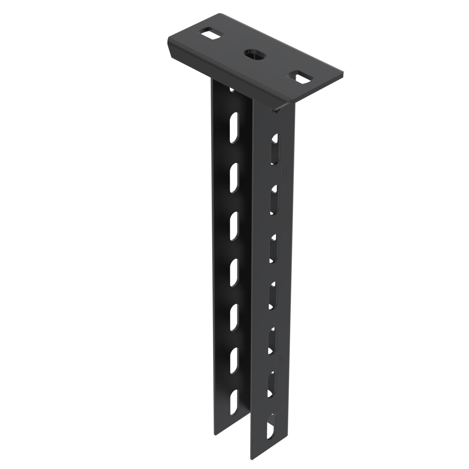 Tuotteen kuvausSuspended support made from U profile with welded-on head plate, perforated to 3 sides, for the creation of support constructions for cable trays. Suitable for mounting on horizontal concrete ceilings and steel supports. Wall and support bracket can be mounted on both sides of the U suspended support. Spacer DSK to insert, from bracket width 400 mm or when mounting the bracket on the end of the suspended support. With black powder coating.