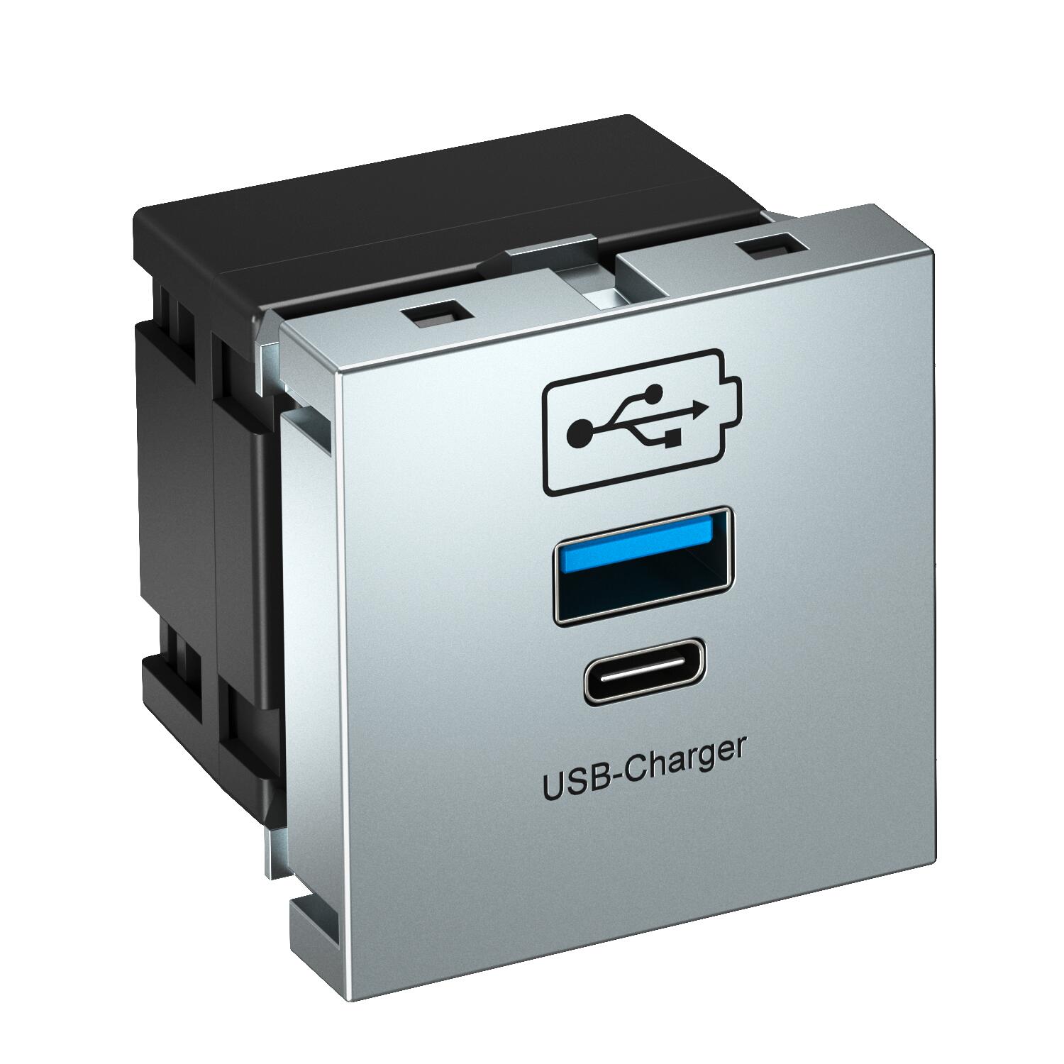 Tuotteen kuvausUSB-Ladegerät mit einer USB Typ A-Buchse und Typ C-Buchse für ein bis zwei mobile Geräte (z.B. Mobiltelefone oder Tablets). Geeignet zur Installation in Geräteeinbaukanälen Rapid 45, Geräteeinbaukanälen Rapid 80, Installationssäulen und Unterflur-Systemen im Innenbereich.